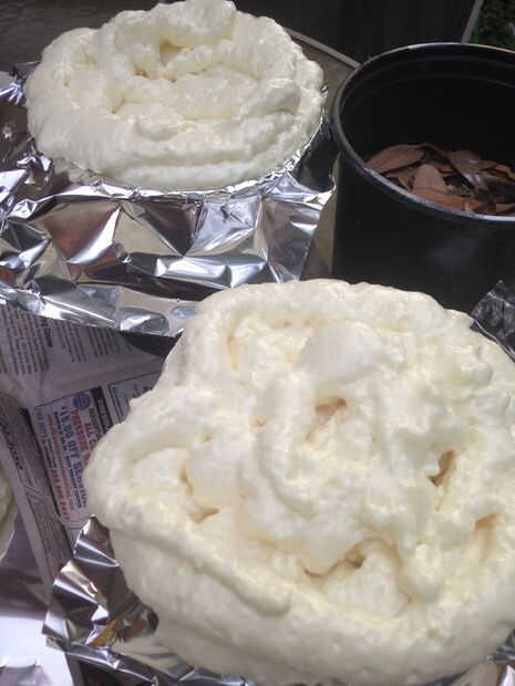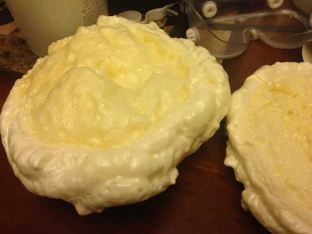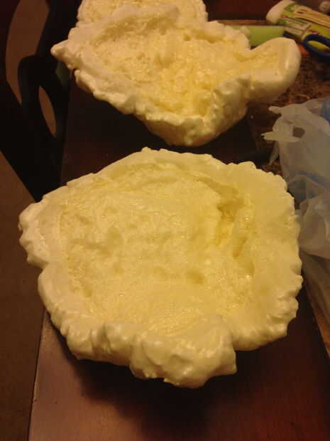 Está bien, así que iba a crear un tema "bajo el mar" para nuestro campamento de verano iglesia y quería crear algo un poco más interesante que el "papel pared y crayon look". Así que he decidido intentar hacer algunos coral mar de espuma en aerosol. Presentado algunos hoja de lata. Algunos colocan acostadas, y algunos arqueado en una maceta para crear una forma curvada. Yo sabía que quería el coral a diferentes niveles y mucha textura. Compré algunos aerosol espuma (aislamiento que se expande) y decidió probar el coral "Copa" de esta manera. USAR GUANTES!! Es muy pegajosa! Rociarlo en las formas de copa y también en formas ovaladas poco en el papel aluminio y rociar todos los que se puede obtener fuera del recipiente y luego dejarla reposar unos 15 minutos. Puedes intentar darles forma doblando el papel de aluminio por debajo en "arcos" para que comience a tomar la forma de una pieza de tipo coral "Copa". Como he dicho, después de que te gusta la forma, dejar reposar unos minutos... No deje que se seque completamente todavía, pero cuando es un poco dura y no pegajosa al tacto, tratar de quitar el papel aluminio de la parte trasera de cada pieza. Si esperas demasiado tiempo, el papel de aluminio será permanentemente parte de la coral... puede que quieras, pero no lo hice, así que tiré de cada pieza y por ello, a continuación, crea aún más textura de burbujas en la parte inferior que me gustó mucho el look de. Le dio un aspecto orgánico y que era perfecto para el realismo. Entonces que las "tazas" o vainas... todo lo que quieras llamarlos, seco totalmente (hora o más).