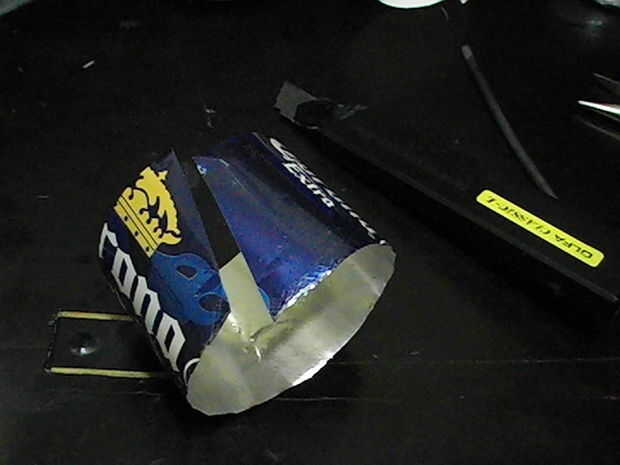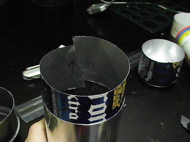 como se puede ver en la foto corté una tira a lo largo de todo el perímetro de la lata, y luego hice un corte diagonal para abrir el "anillo" esto fue una medida intencional