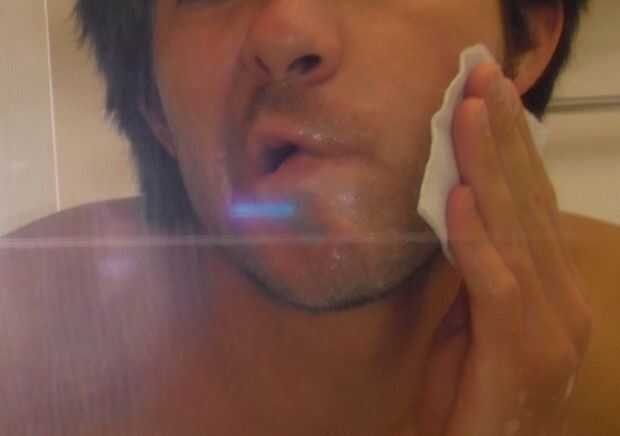 En la ducha o en el lavabo, lavarse la cara con agua caliente caliente y jabón de cara suave, más caliente que se sienta cómodo. El calor abre los poros y afloja la piel que es beneficiosa para evitar cortes y pelos encarnados. No seque su cara.