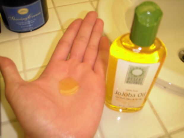 Aplicar generosamente el aceite de jojoba, trabajando en el vello facial. Se trata de aceite para antes del afeitado que ayudará a la maquinilla deslizarse a través de la piel y dar una capa de protección en la cara. Aceite de jojoba se utiliza normalmente como una crema hidratante orgánica y el ingrediente clave en algunos productos de tratamiento tópico de cabello encarnada.
