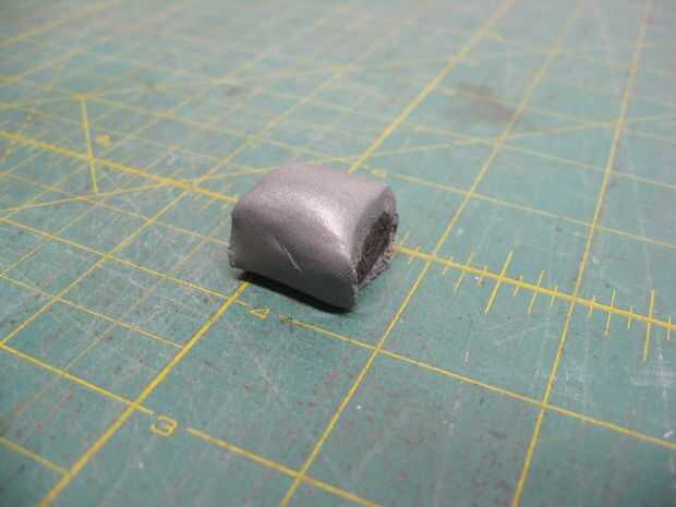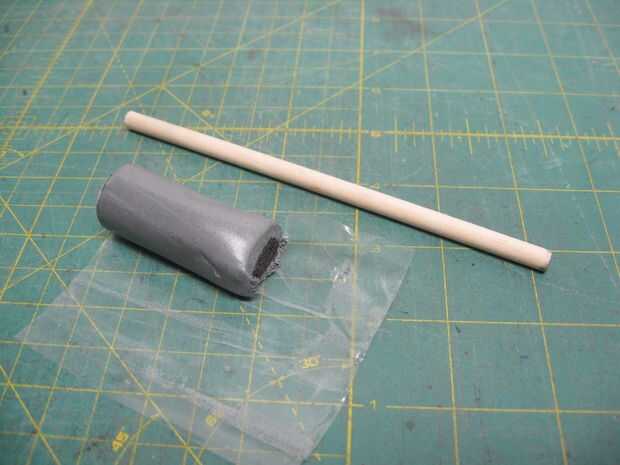 De la parte inferior (que es hasta ahora), uso una clavija de 1/4" para presionar la masilla de epoxy firmemente hacia abajo todo alrededor de la parte superior de la menor puede contra la parte con forma de cúpula de los más grandes pueden.