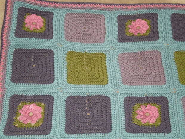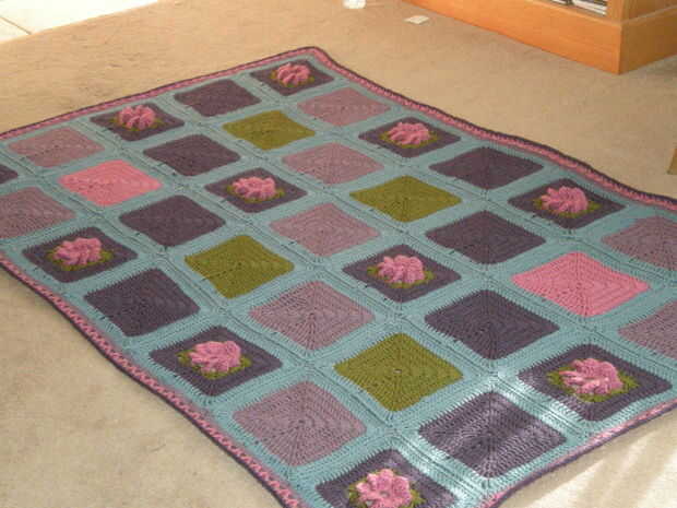 esto es un afgano que diseñé con opción de Vanna de León marca hilado Co. en polvo púrpura azul, púrpura, polvo, color de rosa y oliva. Usé 2 cuadras de ganchillo el libro 200 bloques del ganchillo por Jan Eaton y un gancho. Usé 12 plazas de la flor de dimensiones y plazas de tipo abuelita llano 23. Usé el polvo azul para las dos últimas filas de cada plaza y se unió a las plazas. El afgano mide aproximadamente 46 "x 70". Hilo opción de Vanna es hermoso trabajar con y suave. Mi favorito para los afganos.