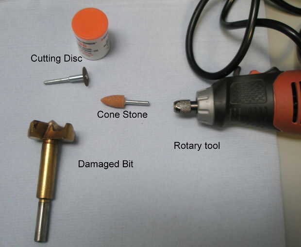 Para enfocar utilizo una herramienta giratoria como una Dremel o en la foto es una black & Decker uno. Un corte de disco utilizado para el área plana y un cono en forma de piedra de la zona redondeada (ver imagen). Lo importante es quitar la misma cantidad de material de cada superficie para que la broca todavía funciona como está previsto.