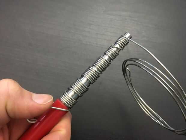 Enrolle el cable ajustadamente en cada paso del mandril. Prueba y haz 5 o 6 bobinas alrededor de cada paso. Usted podría también hacer cada paso por separado si usted está encontrando difícil. (Fotos 2-4)