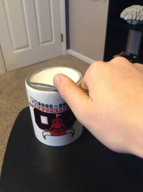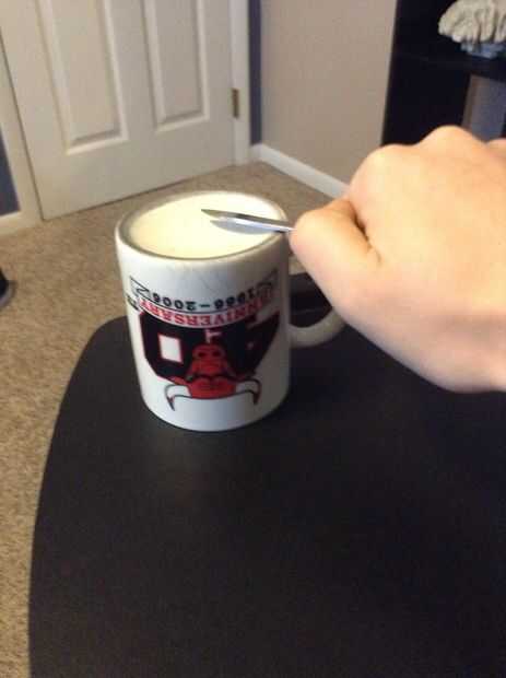 Ahora, tome el cuchillo en un ángulo de 20 grados a la taza de café, sharp orientada al lado opuesto a usted. Le dan una fuerza hacia abajo, pero no demasiado. No quiero romper la hoja. Ahora tire el cuchillo hacia usted. Ahora voltea la hoja y hacer el otro lado. (Asegúrese de que se sujete la taza de café. Estaba tomando una foto la mano con que generalmente tengo.)