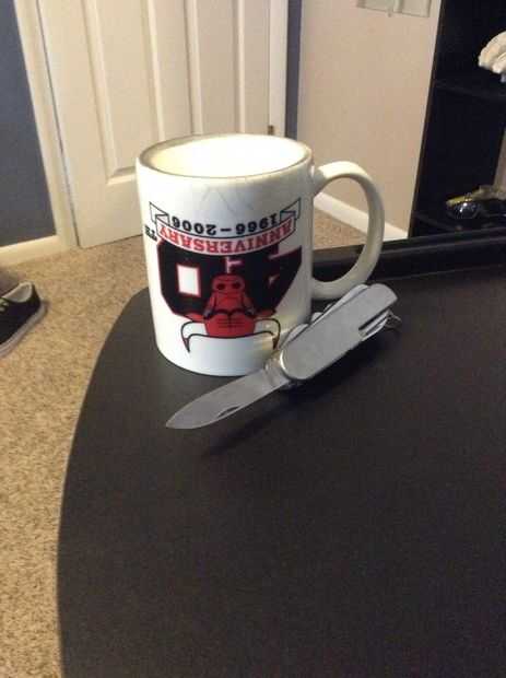 La parte inferior de la taza de café actúa como una piedra de afilar, debido a los materiales gruesos. Al tirar de la hoja hacia usted (hoja mirando lejos, ¡), hacer la hoja lentamente moler. (Afilado).
