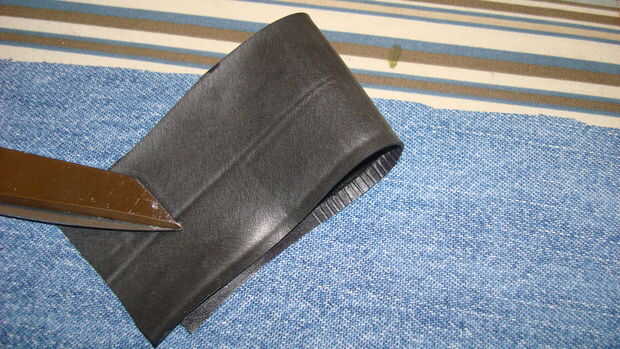 navaja de mango de cadena de bicicletauna lámina de cuchillo roto, sin uso y una cadena de bicicleta aceitoso nacido fuera del matrimonio...1.Es la parte inferior de la hoja con dos orificiosestaba equipado con el conector de cadena, martillado junto