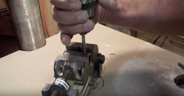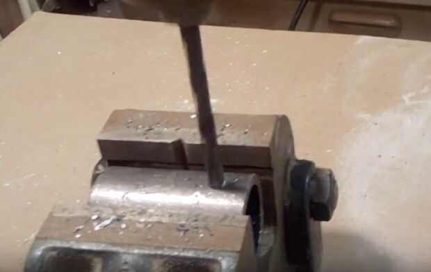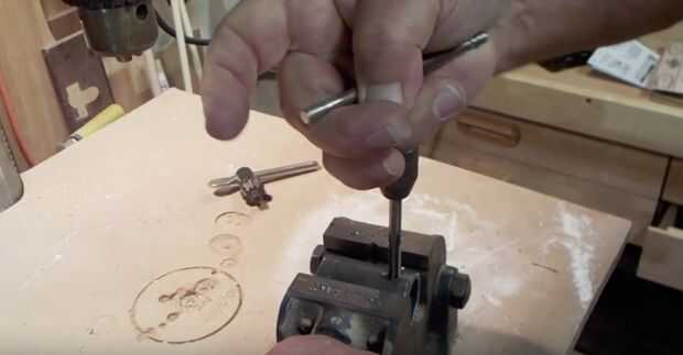 Me arrojó por el tubo en la prensa de taladro y perforar a través de la pared de la tubería de 1/4"-3/8" en el extremo. Entonces volcó la pipa y perforaron otro 1/4"-3/8" desde el lado opuesto en el lado opuesto. Después de eso, había aprovechado los agujeros con 20TPI llave de 1/4". Realmente comencé el corte del hilo de rosca con la llave en el portabrocas del taladro y acaba de cumplir la tirada entera. Esto me dio un recta punto de partida. Una vez que había cortado un poco en él, había quitado la llave del portabrocas y lo pones de nuevo en el mango original para él y acabó golpeando el agujero así. Aprovechado tanto de los orificios.