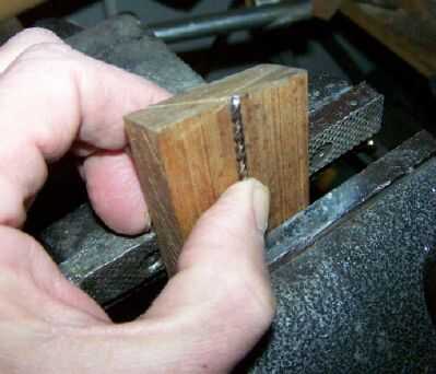 Lugar un poco en la ranura "V" en la cara trasera del bloque. Coloque el bloque en una prensa de tornillo para que el extremo de la broca quede en la parte superior y contra las mordazas y de modo que apenas se extiende por encima de la superficie angular del bloque. Gire la broca para que la vanguardia de la primera mitad sigue la línea de guía. Utilice una abrazadera de "C" para mantener la broca en su sitio. Poner aceite en una manopla pequeña, como los usados para afilar anzuelos. Movimiento a lo largo de la superficie angular del bloque por lo que se está afilando la broca al mismo tiempo. Cuando la piedra ya no es corte de la broca, gire la mitad de una vuelta y afile el otro lado. Inspeccione la broca con una lupa, si es necesario.