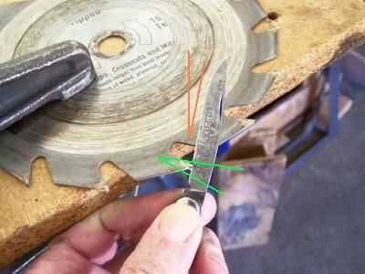 Dibujar el filo de la navaja contra una esquina delantera en un diente de carburo. No necesita usar mucha presión. Algunos pases repetidos hará maravillas a un disco. Las líneas verdes representan el ángulo de la cara del diente y el ángulo en que se sostiene la hoja. Las líneas marrones representan una línea vertical y el ángulo de la vertical en la que el cuchillo es dibujado en la esquina del diente de carburo. Sacar lentamente el cuchillo. Sostenga la hoja con las dos manos para mantener el borde en la esquina relativamente pequeña del diente.