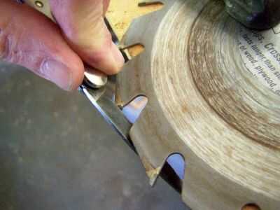 Después de unos golpes por un lado, voltee el cuchillo. Utilice los mismos ángulos en relación con el diente de carburo que usaste para el primer equipo, pero sacar el cuchillo desde el otro lado de la hoja de sierra. Afilado de un lado de la hoja del cuchillo y luego los otros cada pocos trazos se alternan.
