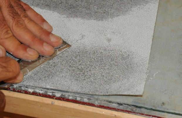 La parte más olvidada del tuning un cincel es aplanar y pulir la parte posterior. La forma más sencilla que he encontrado para hacer esto utiliza papel de lija y un trozo de cristal. Usando un atomizador, rociar el agua en la parte posterior de una hoja de papel de lija que generalmente crea suficiente succión que se adhieren al vidrio. Dependiendo de la condición del cincel, elegiré la arena adecuada pero generalmente empiezo con lija de carburo de silicio de capa abierta de grano 80. Muevo el cincel y hacia atrás (a lo largo del eje del cincel), manteniendo la espalda, plano contra el papel, hasta que las marcas en la espalda son constantes en toda la superficie.