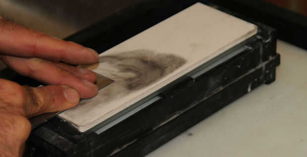 Después de utilizar papel de lija, pulir la parte posterior con un conjunto de piedras de agua japonesas.