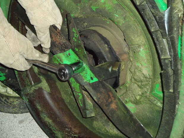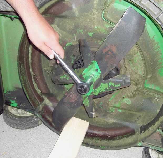 Consejo: Es una buena idea poner el cortacésped hacia atrás sobre sus ruedas mientras que afila la hoja.