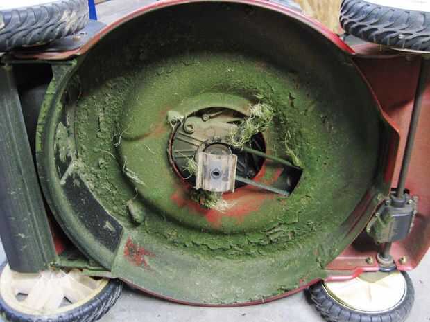 PRO punta de varios comentaristas: Rocíe la parte inferior de la cubierta con antiadherente de cocina en aerosol (como PAM) al menos anualmente y enjuague la parte inferior de la cubierta después de cada corte. Esto previene una acumulación de residuos como ves en mi podadora. Gente excelente tip, gracias!