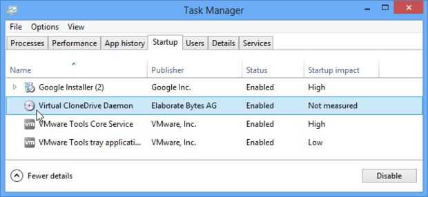 En Windows 8, abra el administrador de tareas (haga clic derecho en la barra de tareas y selecciona iniciar el administrador de tareas) y haga clic sobre la pestaña Inicio. Desde aquí, usted puede administrar sus programas de inicio sin necesidad de instalar ningún otro software.