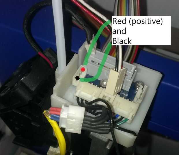 Por lo que es la fuente de alimentación en la parte superior izquierda de la tabla por encima de su cabeza de impresora. Usted puede pegar un alambre en el rojo y el otro cable al negro y vincular el rojo al positivo de lo LED y el negro al negativo para encender el LED.
