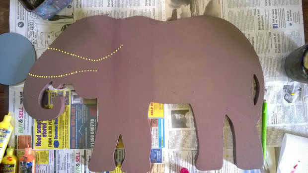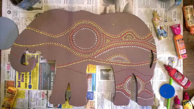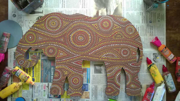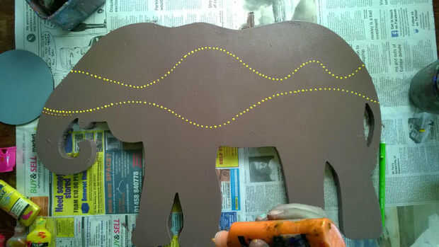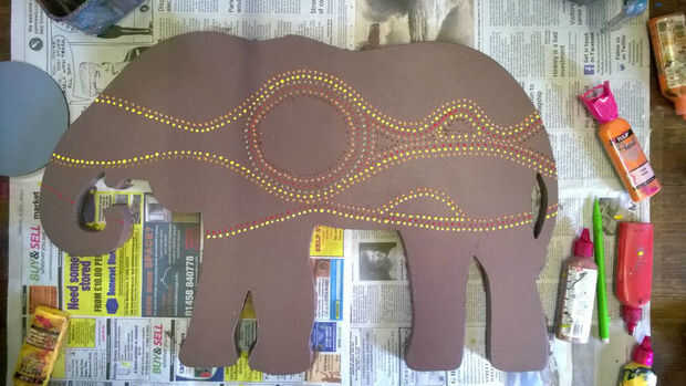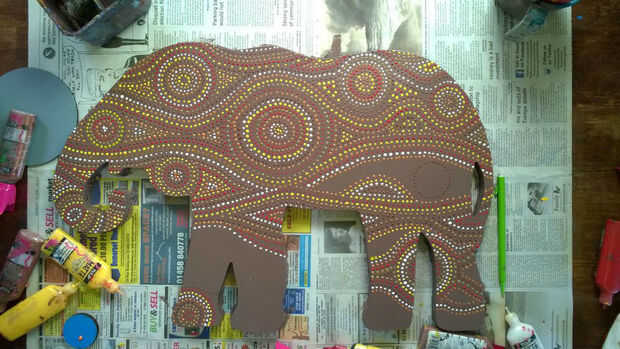 en de la pauta que ha dibujado en seguir con los puntos de pintura, cada punto debe ser aproximadamente de 4 a 5 mm aparte. Continuar con el mismo color en toda la línea solicitada. Repita este proceso en cada una de la pauta con un color diferente. Una vez que las directrices han sido pintadas y se han secado es un proceso simple de otro color y seguir el camino de la línea punteada alrededor de 5 mm a su lado. Esta repetición del proceso después de cada línea y elegir colores diferentes cada vez en hasta todo el espacio en el elefante ha sido cubierto.