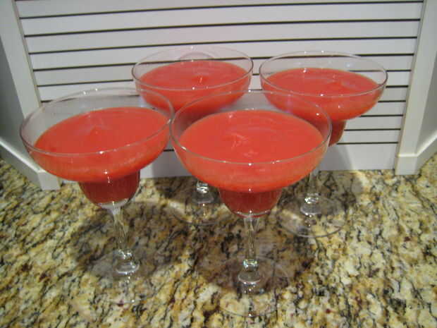 Ahora puedes decidir cómo quieres el gelo cuando se encuentra. Puede verter toda la mezcla en un molde, un recipiente, bandeja rectangular, o hacer lo que hice y use unos lentes de margarita! (Hacía los para un brunch para algunas novias.)