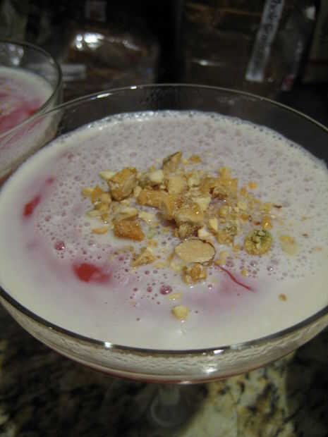 que esperaba hacer crema batida, pero todo había en la nevera era irlandés crema mitad y mitad, así que decidí que batir un poco y usarlo como una especie de imitación de crema inglesa. Puesto que ya fue con sabor, no hacía falta añadir azúcar, extracto de vainilla o cualquier cosa. Después de batir un poco, me rociaron la dulce bondad del gelo y había cubierto con algunas nueces picadas. Todo el mundo le encantó!!
