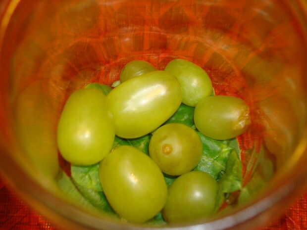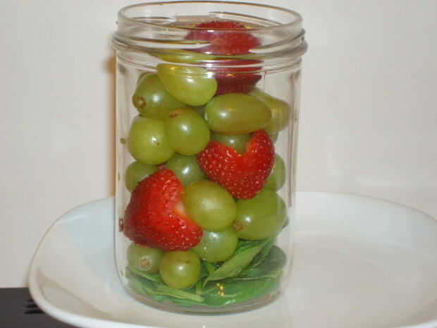 Utilizar las uvas para sujetar la fresa en su lugar mientras llenas la jarra.