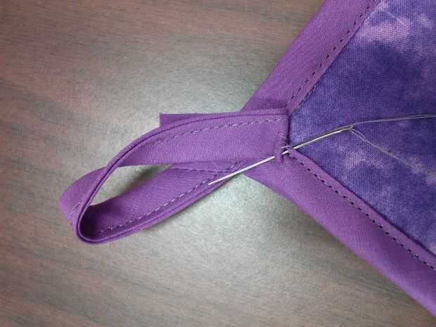 Plegar la tela extra y puntada de la mano en la parte posterior de la agarradera. El lazo debe ser aproximadamente de 2" de largo.