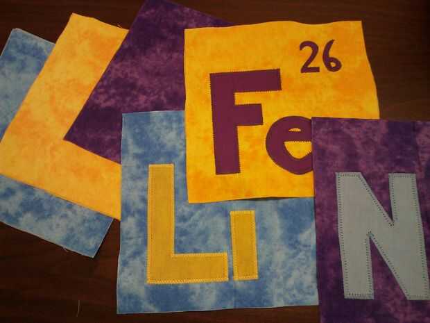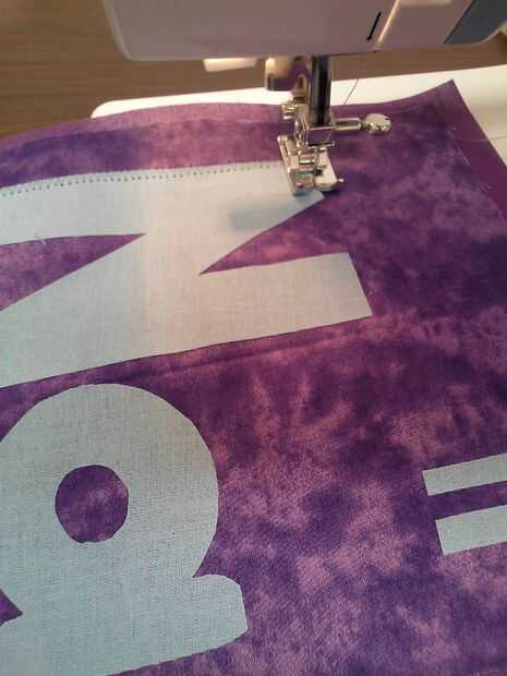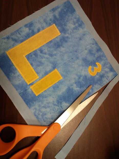 usé una puntada de zig-zag ancho alrededor de las letras grandes y una puntada de zig-zag pequeña alrededor de los números. En lugar de invertir el pie prensatela para bloquear las puntadas al final, me suavemente tire el hilo superior hacia atrás y atar al hilo de la bobina. Esto evita que desordenado de arranque y parada puntos. Después de todas las letras y los números han sido apliques en, recorte cualquier exceso de tela para que cada cuadrado es 7".