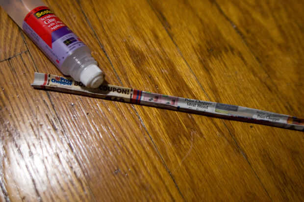 Repita el plegamiento en tercios y pegar una vez más, para que tengas largas tiras de periódico doblado alrededor de un cuarto de una pulgada de ancho. Este es posiblemente el paso más difícil, ya que son plegables varias capas de periódico pegajoso juntos. No esperes pasar de este paso sin dedos pegajosos...