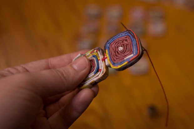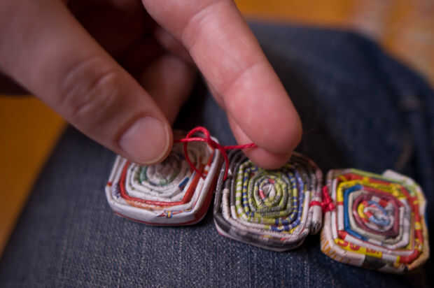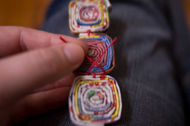 Enhebre la aguja, anudar no es necesario. Empuje el borde de una unidad de papel, entre las dos capas más externas del rollo de papel y en el centro de un lado de la Plaza. Páselo a través para que tengas una o dos pulgadas de cadena izquierda colgando hacia fuera el lado opuesto de la Plaza.