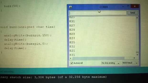 int buzzpin=9; void setup() { pinMode(rcvpin,INPUT); pinMode(buzzpin,OUTPUT); buzz(200); buzz(200); buzz(200); delay(2000); Serial.begin(9600); } void loop() { int ldrval=analogRead(rcvpin); Serial.println(ldrval); if(ldrval>=900) { buzz(50); } } void buzz(unsigned char time) { analogWrite(buzzpin,170); delay(time); analogWrite(buzzpin,0); delay(time); }