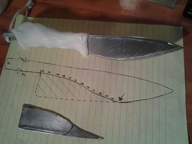 Lo que fue un 7,5 en. cuchillo de espiga de 1/2 ahora es un cuchillo de espiga completa con un mango moldeado personalizado. Comencé trazando el cuchillo sobre el papel para trabajar la forma que quería. Una vez que fue decidido, dibujé la forma que quería en la hoja. También hice 2 sangrías en direcciones opuestas para evitar que el mango resbale una vez moldeado. Si usted es cuidadoso y tiene suficiente paciencia puede hacer el corte utilizando un disco de corte. #409(dremel) después de que el corte se hizo asumí el cuchillo a la amoladora trabajar hacia abajo, luego en papel de lija, finalmente a la piedra de afilar. Ahora es muy fuerte. Jugó alrededor con ideas diferentes para el puño de para-cuerda a un agradable bosque o piedra de la manija. Los dos últimos que he decidido aún no soy lo suficientemente talentoso para.