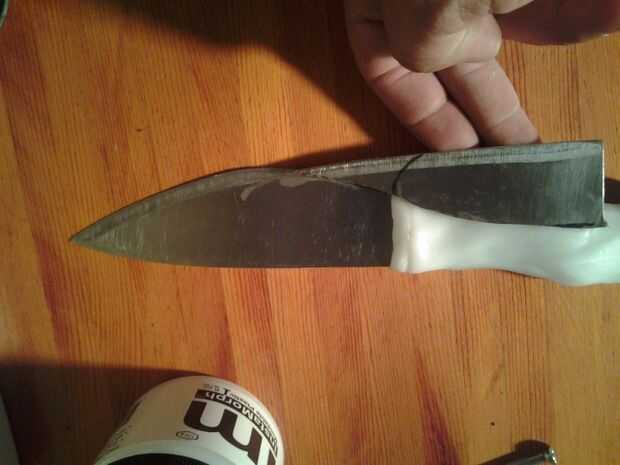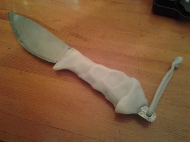 He encontrado muchos usos para él, pero hasta ahora esta es mi favorita. me trajo unas 4 tazas de agua a hervir. Luego vierte aproximadamente 2 onzas de instamorph. Una vez que resultó claro quitar pegote y trabajó rápidamente para moldearlo mientras estaba todavía caliente para que todo fusionado. Ahora que había consolidado el plástico posicioné mi tenía cómodamente alrededor de la manija y exprimido lo suficiente como para dejar mi agarre en el mango. Por último pongo el cuchillo en el congelador para programar rápidamente el plástico para evitar la caída.