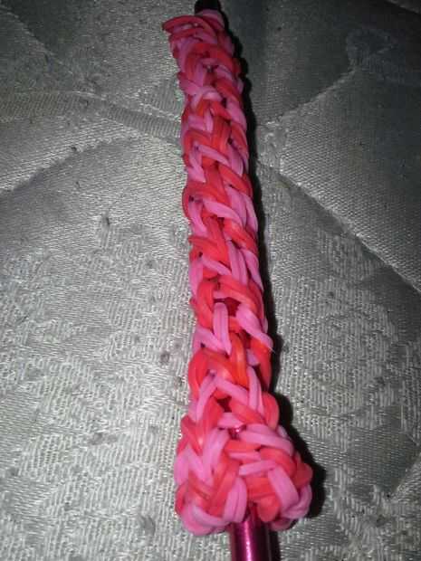 Pulsera única de telar del arco irisPaso 1:Coloque una banda roja en el telar.Paso 2:Luego, colocar una banda amarilla en la dirección opuesta.Paso 3:Continuar ese proceso en el orden del color del arco iris. Pare en el color de rosa.Paso 4:Luego agr