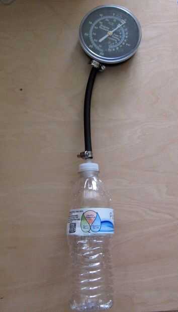 Este dispositivo simple y barato (un comercial de uno le costará $97) medirá la fuerza de agarre de mano. Se hace de 4 componentes: un indicador de presión de bomba de combustible, un tubo de goma, un conector de tubería y una botella de agua plástica.