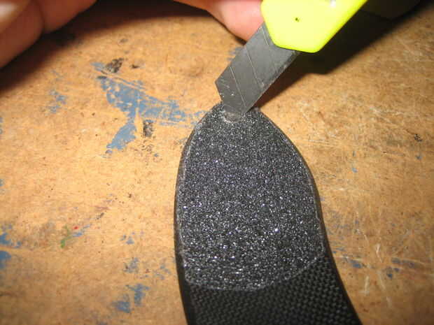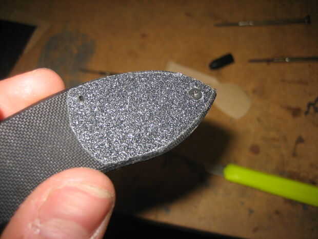 4. girar el U-cuchillo alrededor en el agujero un poco para escariar hacia fuera de la cinta, no tarda mucho. Una vuelta o dos es todo. Tenga cuidado de no eliminar cualquier de la escala real, solo la cinta. Prueba droping en el tornillo, si se hunde (como en la foto 4), bien, si no resma un poco más. Ahora hacer el orificio del tornillo