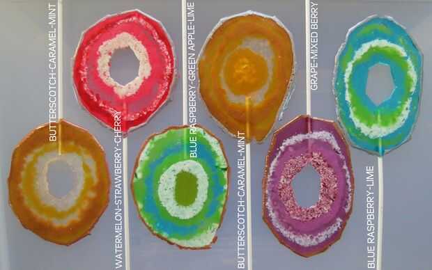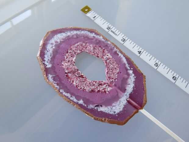 En mi primer experimento, naturalmente he intentado organizar anillos de caramelo triturado (de varias marcas, colores y opacidad) todo en una sola vez, pero los anillos todos derretidos juntos y perdió definición. Por lo que experimenté sólo un poco más y estaba satisfecho con el realismo de este método y es simple! Usted puede hacer 5 jumbo "Piruletas de ágata de diámetro, como he hecho aquí, o caramelo simple Ágata rebanadas que puede utilizarse de muchas maneras (yo soy pensamiento cupcakes y decoración de pasteles!).