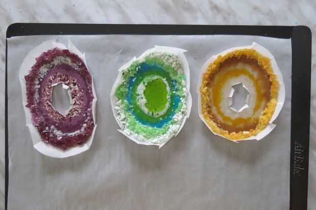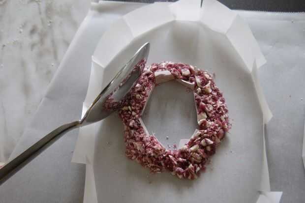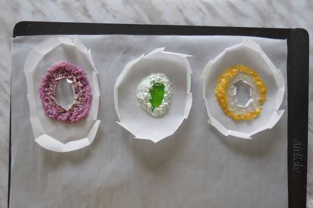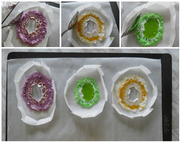 1. organizar el caramelo picado deseado como el primer "anillo". Yo uso una cucharadita colocar el caramelo triturado y utilizar la parte posterior de la cucharilla para empujar el caramelo y garantizar que no hay ningún caramelo perdida en otras partes en el molde cuidadosamente. Cuando se utiliza moldes sin un agujero en el centro, simplemente ponga un trozo de caramelo sólido en el centro. He trabajado en 3 moldes en una bandeja para hornear.