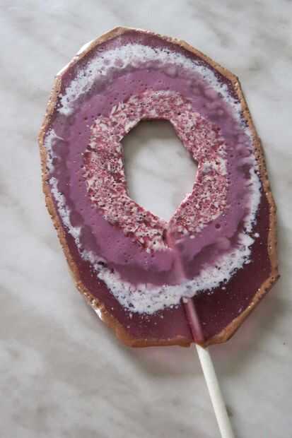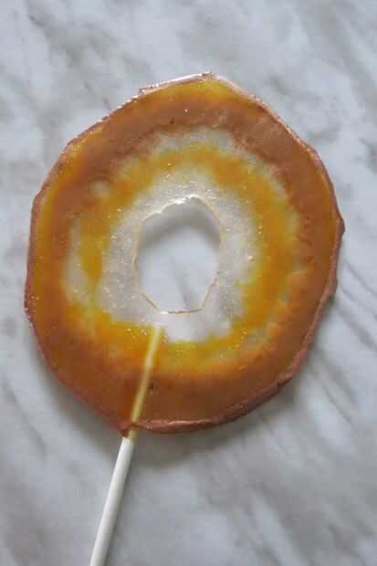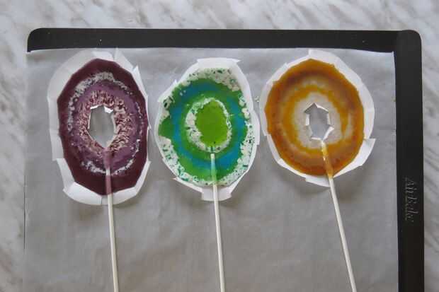4. después de la última capa se cuece al horno, inmediatamente Coloque un palillo del lollipop y doblar el palo para capa, mientras que el caramelo está todavía caliente.