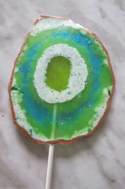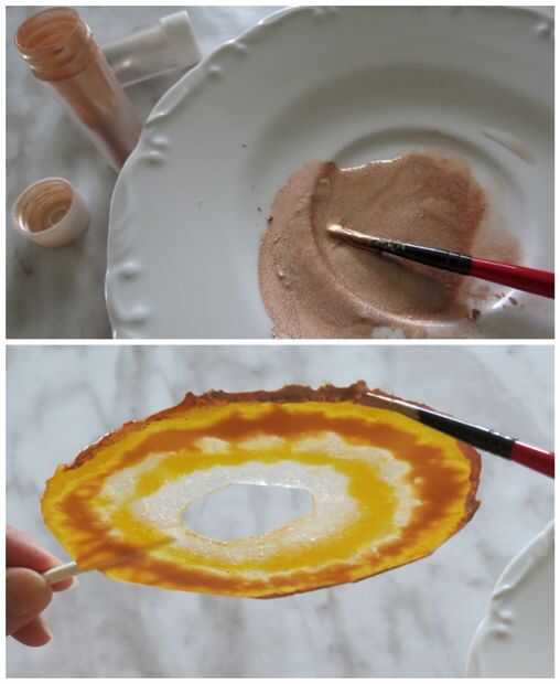 6. opcional: Diluir polvo brillo comestible en agua y pintar los bordes del caramelo. He utilizado polvo de cobre y plata brillo.