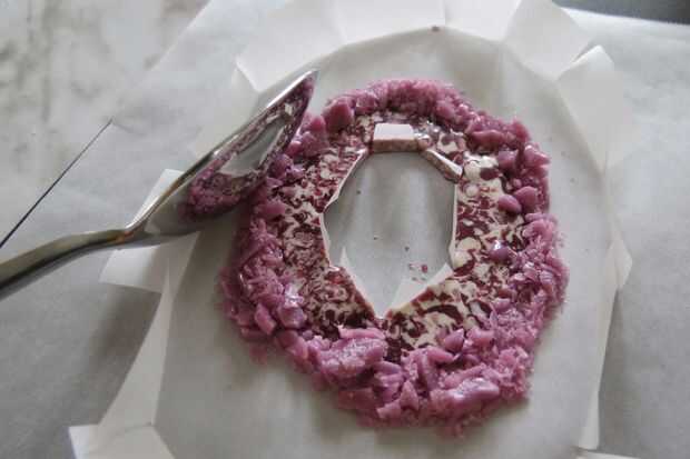 5. Deje enfriar durante 10 minutos. Retire la moldura de pergamino. Prefiero utilizar la parte inferior al horno como el "top" de mi paleta porque es más plana y al ras.