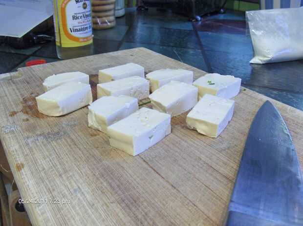 Mientras la salsa se calienta, cortar el tofu en cubo - batuta como formas, acerca de 1 "x 3/4" x 2 ".