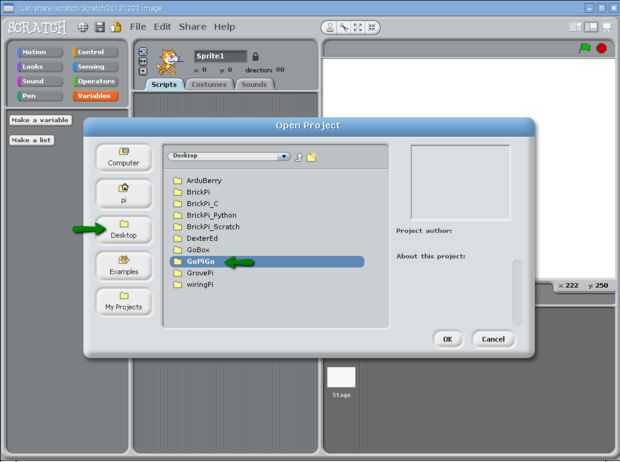 Lanzamiento de cero a través de la interfaz de "Scratch para Robots". Si usted necesita ayuda con este paso, por favor siga las instrucciones descritas en este tutorial Click en archivo/abrir (también puede usar Ctrl-O un acceso directo) para obtener el cuadro de diálogo de archivo. Haga clic en el botón escritorio, luego haga doble clic en la carpeta GoPiGo .