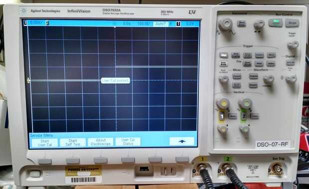 Este osciloscopio Agilent DSO7032A tiene una función de calibración automática integrada agradable que debe configurarse manualmente mediante un pequeño interruptor accesible a través de una ranura en la parte superior trasera del dispositivo. Este interruptor debe hacerse con una herramienta plana y estrecha de su elección, como un destornillador o la llave del coche.
