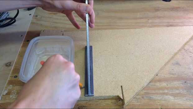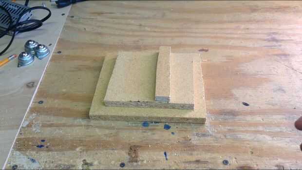 Los tableros de madera son la estructura base para el agitador todo. En primer lugar, los tamaños necesitan ser marcado para el corte. El tablero superior de madera debe ser cerca de 1.5" de mayor (en todos los lados) que el envase de plástico utilizado para el proceso de grabado. El tablero inferior debe ser de 2" más grande (en todos los lados) que el tablero superior. También, una longitud amplia de 1" de madera debe ser marcado hacia fuera para sostener el motor. Después de todas las tarjetas están marcadas en la madera de desecho, puede ser recortar con una sierra de calar.