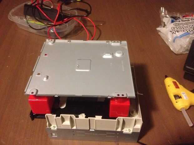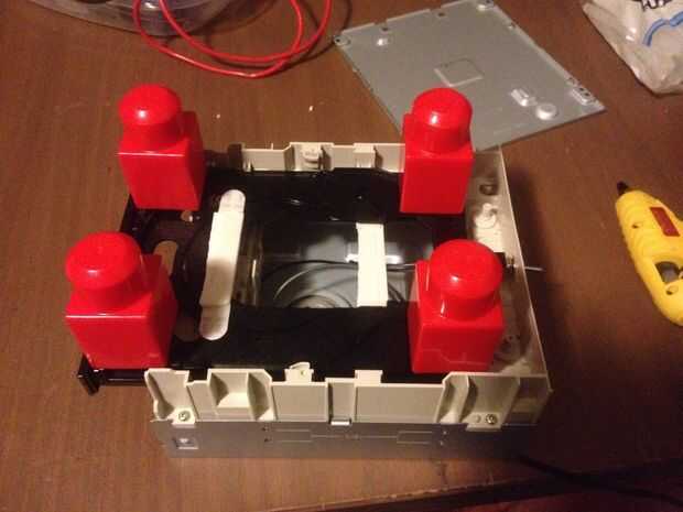 Verás que utilicé unos bloques de plástico, pegamento caliente, la cubierta de metal repuesta desde el CD-ROM y algunos mat de estante del trazador de líneas para una superficie antideslizante en la parte superior.