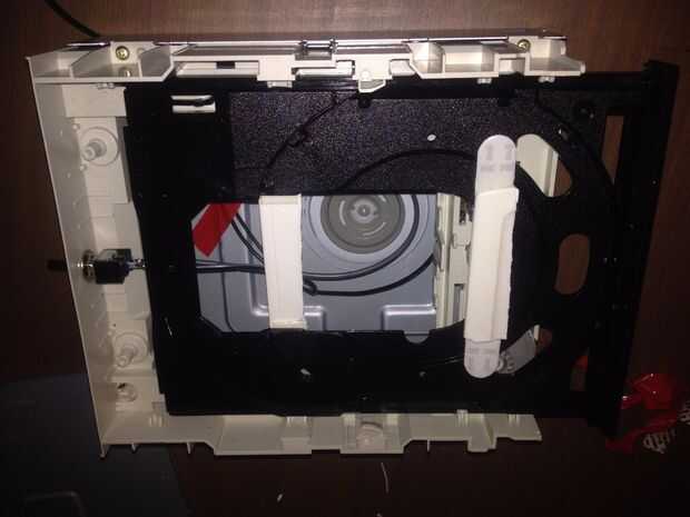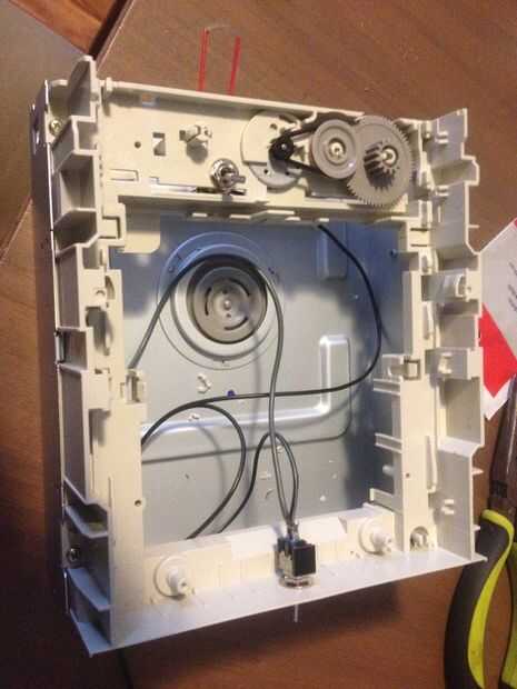 He encontrado un gran lugar en mi disco que ya tenía un pequeño agujero que puede montar el conmutador en. Es necesario pensar también añadiendo una pieza de plástico a la bandeja que servirá para el interruptor, así. En las fotos, puede ver que he añadido algunas piezas de plástico de desecho (blanco) para accionar el interruptor en posición de abrir/cerrar bandeja específica.
