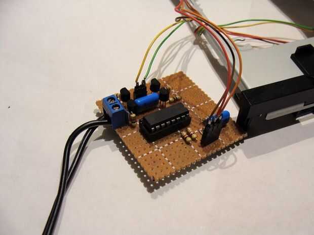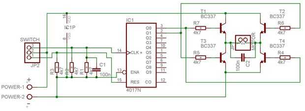Cuando el dispositivo está encendido, la salida Q0 IC será activa, y el motor comienza a girar en una dirección. Si el interruptor es presionado por la bandeja, el IC recibe un pulso en su pin CLK y se activará la salida Q1. Los cambios de motor su dirección y mantienen esta dirección hasta que llegue a la bandeja de la carrera. Este interruptor envía un pulso de reset a la IC y la salida de Q0 se activará otra vez y el motor cambia su dirección de giro nuevo. Este ciclo se repite hasta que el agitador está activado.