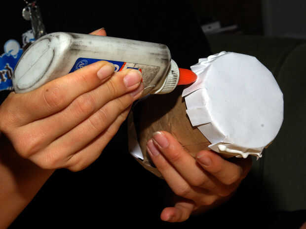 En la mayoría de los tambores de taiko, la piel de cuero es virada hacia abajo puntas llamado byou. Para este proyecto de arte, interpretar cualquier forma que desee. Envolver la "piel" con el hilado o la guita y pegamento abajo o del grano lo que tienes disponible, realmente. Sólo usé hilo.