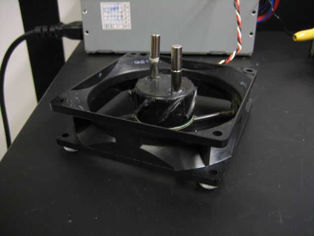 Había salvado los ventiladores desde el equipo que llevó a la fuente de alimentación de. Ventiladores de computadora son ideales para casi todo lo que nunca desecharlos si puedes. Tomé las aletas de mi ventilador, pero no es necesario. Lo único que se necesita es pegar los imanes en su lugar. Ajustaron los imanes en el ventilador de tal manera que los polos magnéticos de la izquierda post cara sur a norte y la derecha post cara norte a sur. Así, en otras palabras, los polos son anitparallel entre sí.