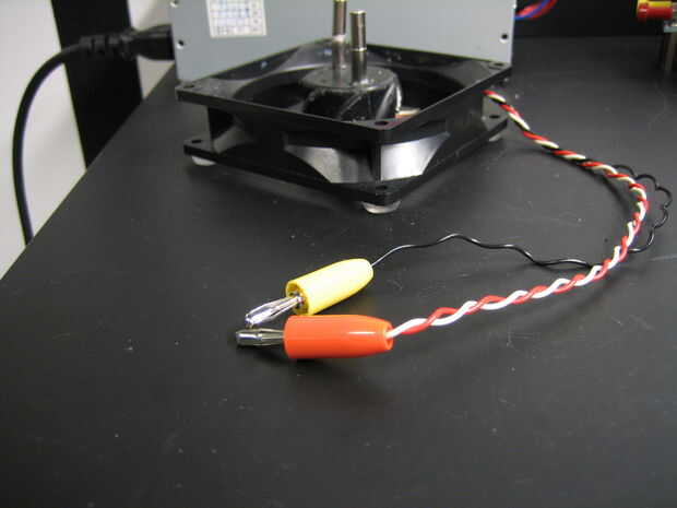 El ventilador que rescató era un ventilador de 12V que tiene 3 cables conectados a él. Con toda honestidad, no tengo ni idea de por qué tiene 3 cables o qué la diferencia entre un cable 3 y ventilador de 2 alambres. No importa como todos hice fue soldadura el plátano se conecta a los cables de tierra y los otros dos para + 12V.